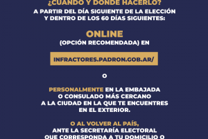 Si este domingo se encuentra fuera del país y no puede emitir su voto, dispone de 60 días para justificar su ausencia. Se recomienda hacerlo de forma online en infractores.padron.gob.ar