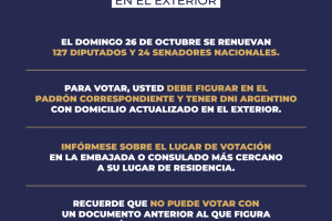 Este 26 de octubre se celebrarán las Elecciones Legislativas 2025. El Padrón se puede consultar en www.padron.gob.ar. Ingrese su DNI y seleccione "Argentinos en el exterior" en el apartado "Distrito" para verificar sus datos y lugar de votación.