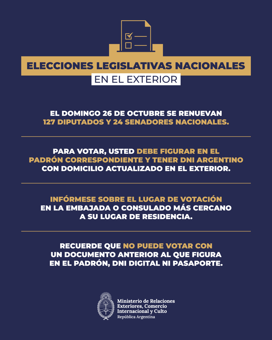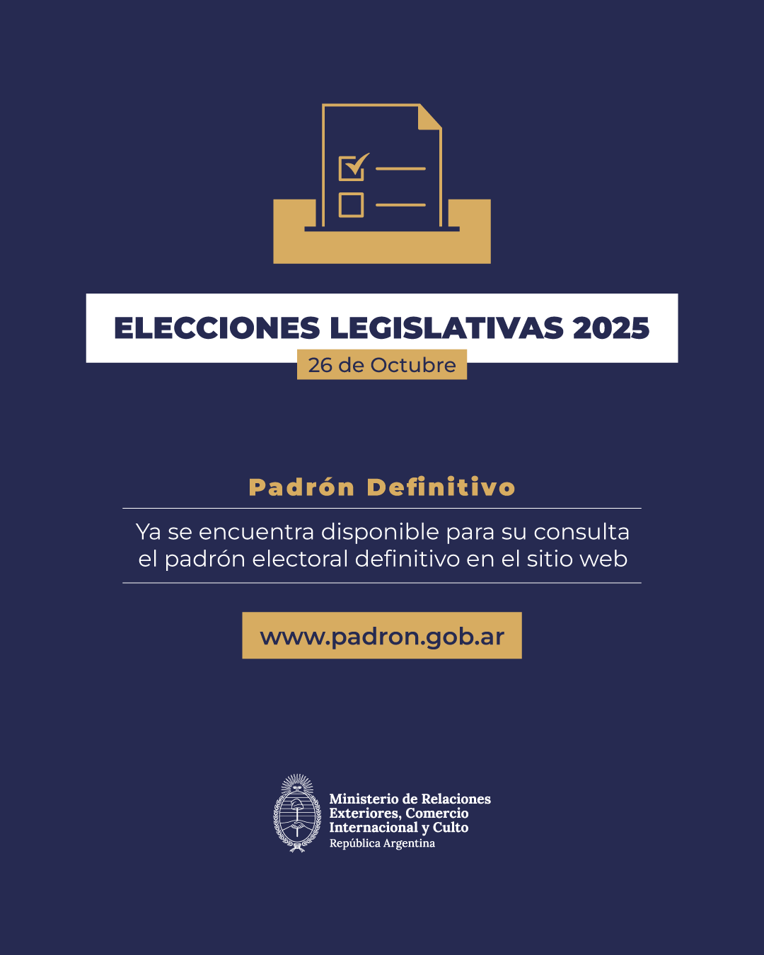 Este 26 de octubre se celebrarán las Elecciones Legislativas 2025. El Padrón se puede consultar en www.padron.gob.ar. Ingrese su DNI y seleccione "Argentinos en el exterior" en el apartado "...